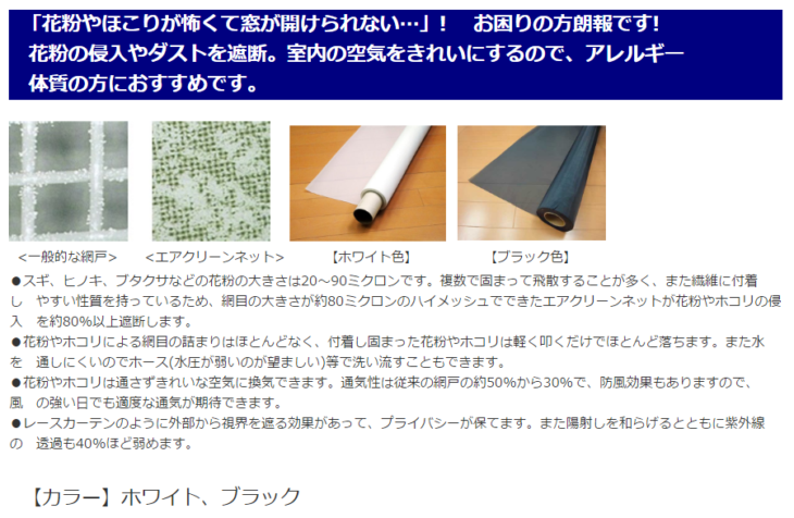 花粉を通過させません。ただ、通風性が50%位