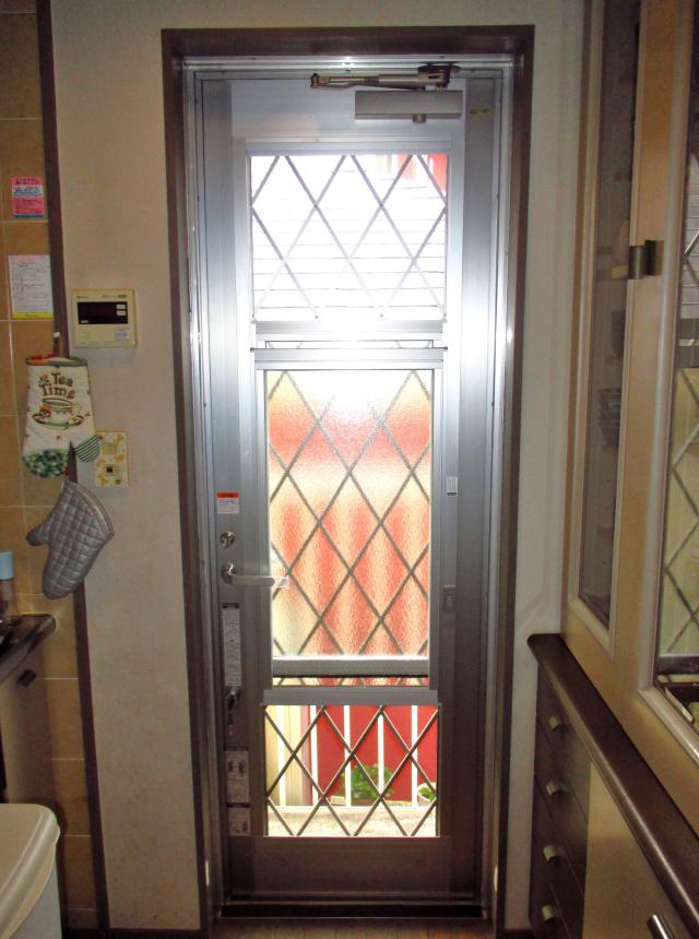 内側に網戸がついている単板硝子の勝手口ドアでした。