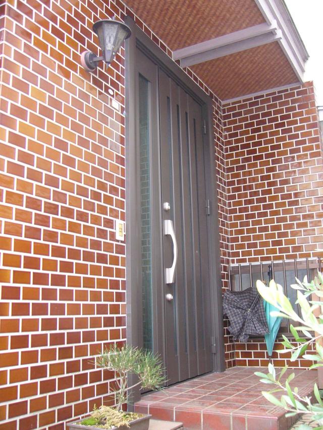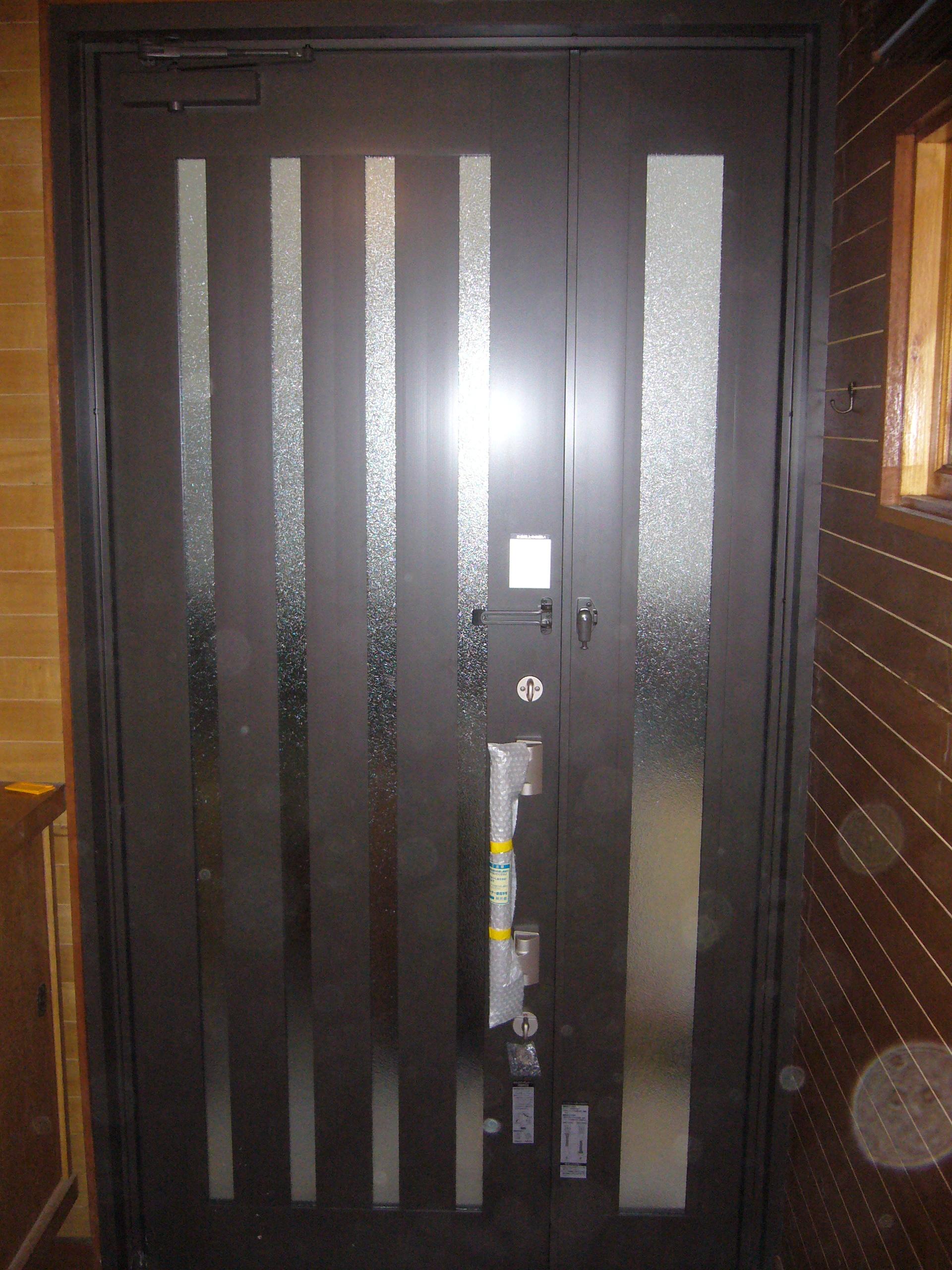 完成です(*^_^*)外見も古い枠が残っているとはわかりません。 見た目・動き・防犯面も全てグレードアップしました。 ※奥様が気にされていた硝子は防犯合わせ複層硝子を使用しています。 今回使用したリフォームドアはトステム製のリシェント親子タイプです。 YKKAP(ドアリモ)・三協立山(ラフォース)も同様の商品が揃っています。 「細かく対応してもらってありがとね!」のお言葉も頂きました。 こちらの方こそ、様々な工事を依頼していただき有難うございましたm(__)m 何か不具合、ご相談等ありましたらまたご連絡下さい。