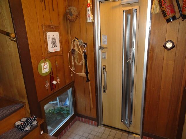 取替前の玄関ドアです。 建付けが悪くなり、鍵の締りが悪く なったので、最新のリモコン錠玄関に 横のFIX窓は防犯・断熱対策で内窓を 設置させていただく事になりました。