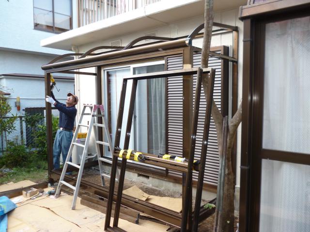 サンルームの施工中です。今回は三協立山の「らんどりあ」という商品です。
