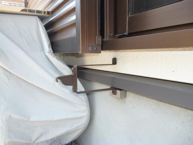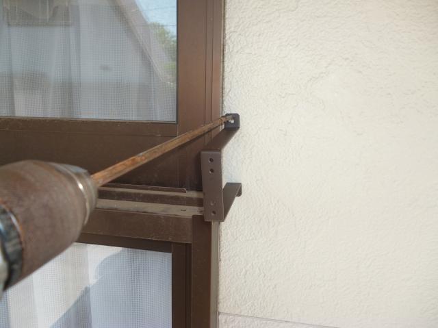 雨戸付の窓に取り付けする時は、写真の様なコの字型で、足長13cmのブラケットを使用します。