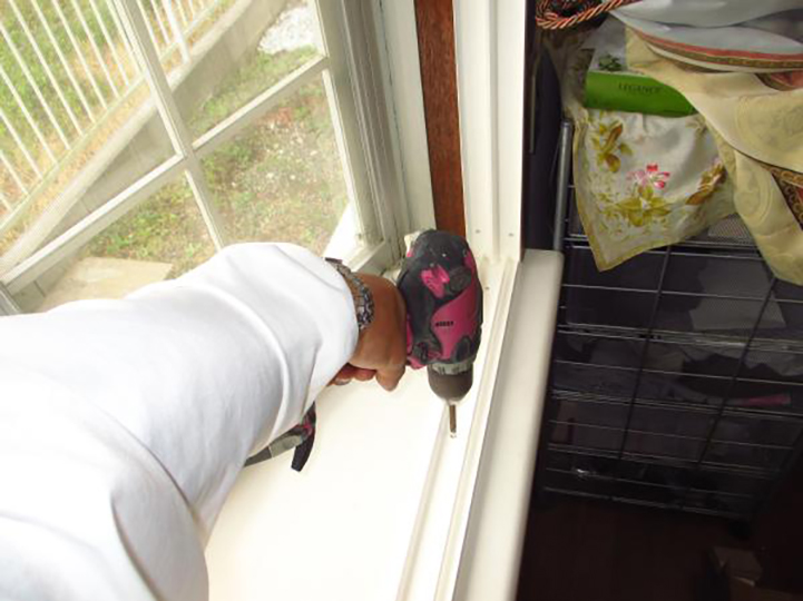 【リビング出窓】ホワイトの内窓樹脂枠を四方にビス止めしていきます樹脂はアルミの1000倍、熱を伝導しにくいので内窓は硝子部を除いて、ほとんどが樹脂で覆われています。ただ芯材には肉厚なアルミが入っているので、しっかりしています(^_^)