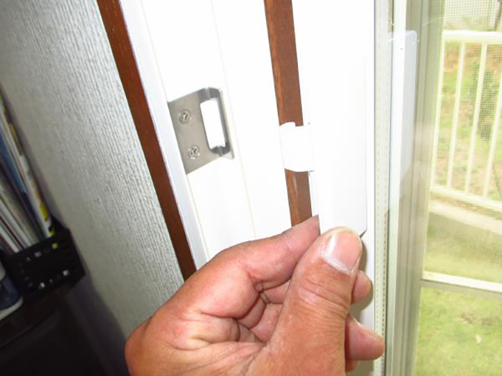 【リビング出窓】こんな感じに窓を閉めると自然にロックが掛かる仕様になっています。開ける時は写真のようにつまんで開けます。バスなどで、たまに使われているかと思います(^_^)