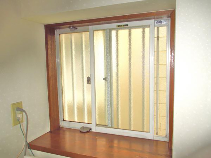 【脱衣所】既存の引き違い窓サッシです4㎜厚の型(くもり)ガラスが組みこまれてます。こちらも陽が当たらなく寒いという事で、断熱(LOWE)ガラス仕様の内窓プラマードUを設置します。