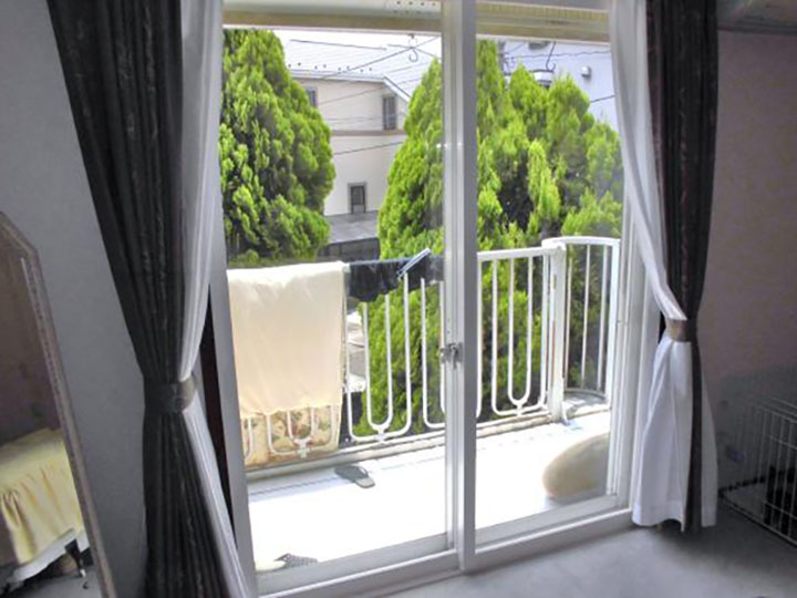 【寝室】寝室の掃き出し窓です。寝る時に外の音が騒がしく断熱性が悪い部屋だと、エアコンの可動時間も長く 睡眠不足になるので、体にも経済的にも良くありません。