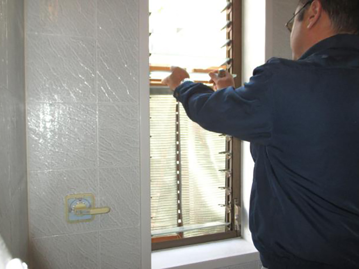 窓交換といっても一日で工事が完結するカバー工法での施工です。一枚ずつ硝子を外します。写真のように硝子が半開き状態ですと、外から静かに硝子を外され、侵入されてしまうので要注意です!