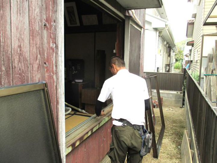 既存のガラス戸・レールなどを撤去して新枠を設置する準備をしていきます。