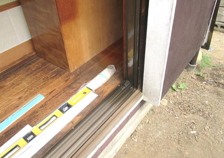 こちらのはき出し窓も、同時進行で進めていきました。アルミ製の新しい枠を水平・垂直を確認しながらビス止めしていきます。