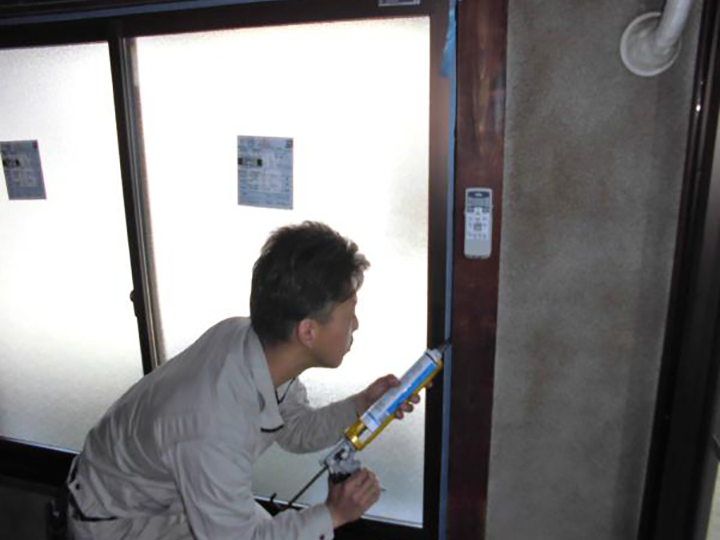 外部・内部と防水処理(シーリング)中です。雨や風が入ると大変ですので、慎重に施します。