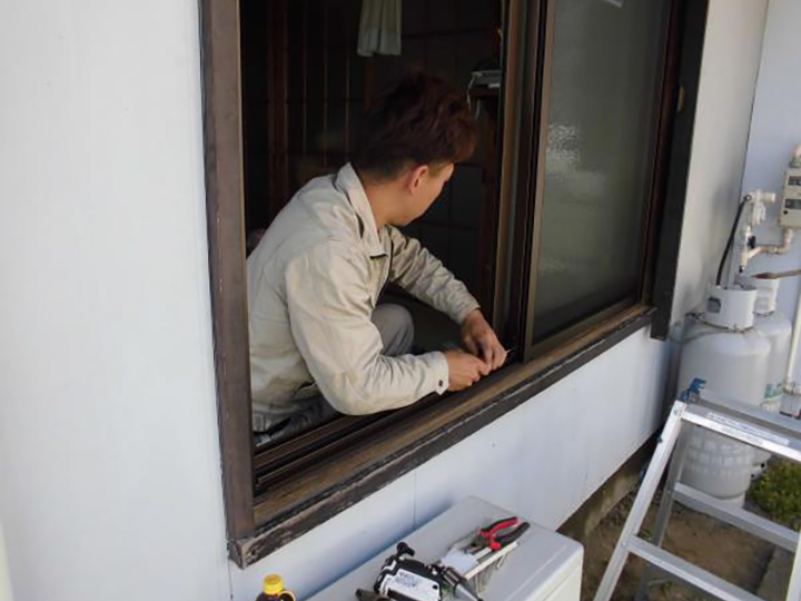 枠の水平・垂直を見ながらビスで固定窓の建付け調整を施しているところです。