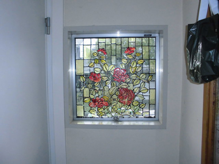 【1階廊下】交換前、既存のすべり出し窓です。綺麗なフイルムを貼られていましたが、動きが悪く単板硝子なので冬は寒く、結露もひどかったそうです^_^;