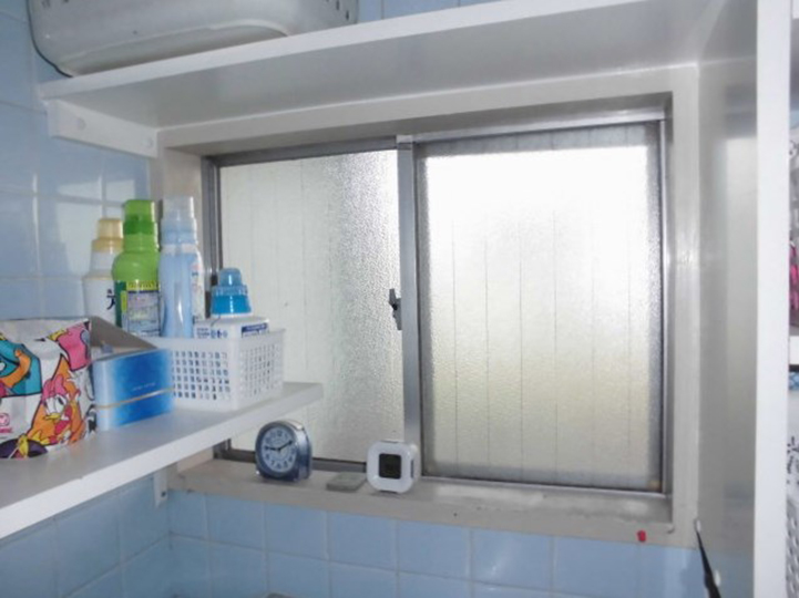 【1階脱衣所】こちらは交換前の引き違い窓です。シルバーの引き違い窓でしたが雰囲気を明るくしたい。という事で・・