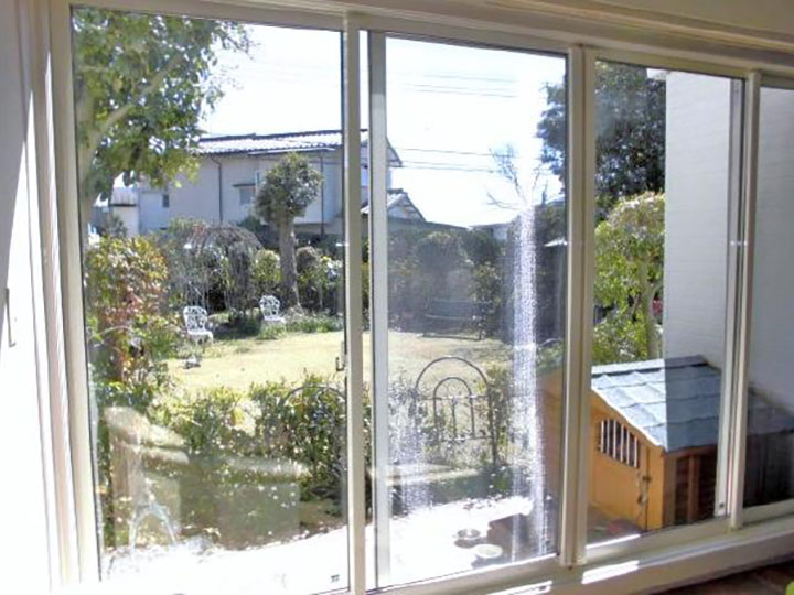 【1階リビング】3枚建て単板硝子の引き違い窓から・・