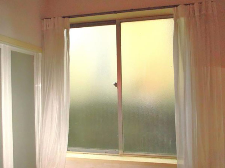 【1階キッチン】こちらはキッチンの2枚建て引き違い窓。裏の死角となっている場所で防犯上よろしくないので・・
